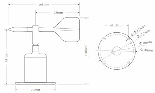 | 计算公式 | 风向值=输出电压/5V×359 | 风向值=(输出电流-4mA)/16×359 | 通信协议:Modbus-RTU |